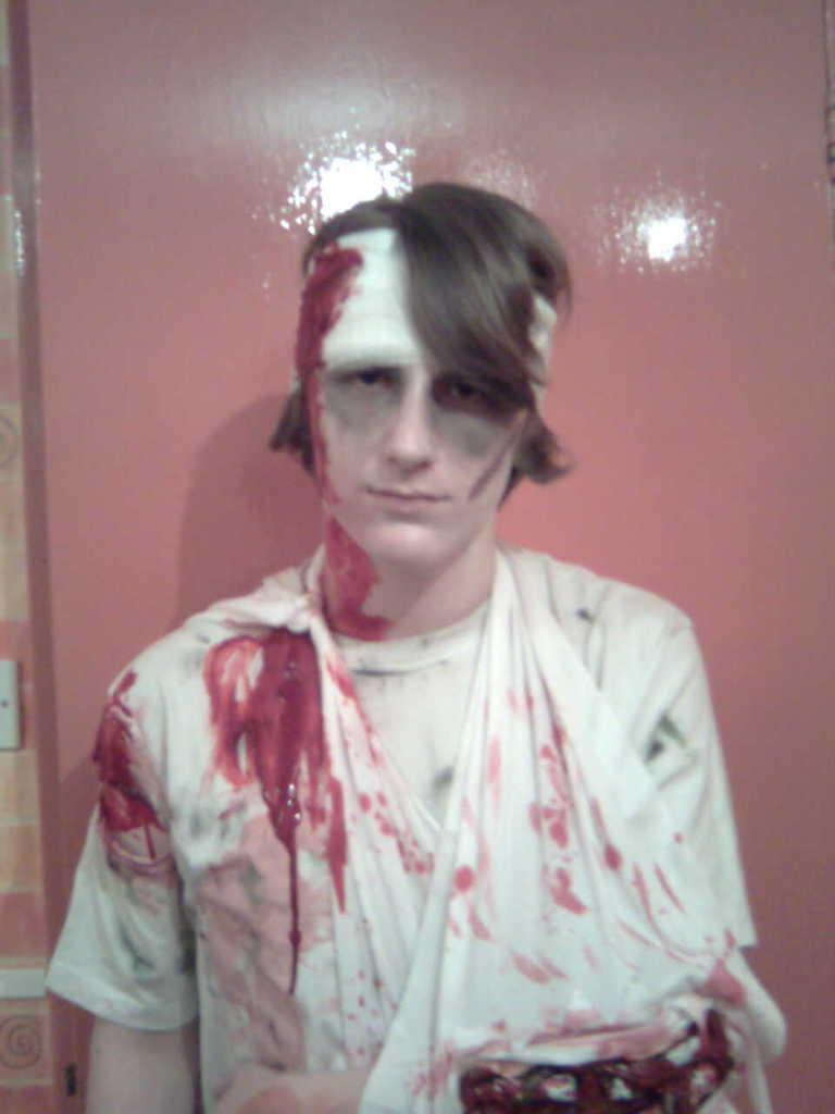 Seeing as how I slacked off, I couldn't make a Great Knife so I improv'd with his spear instead. And there's a lack of blood, I know; pardon the pun, but it bleeds through easily and I was trying to bulk myself up by wearing my favorite puffy vest beneath that shirt. XD