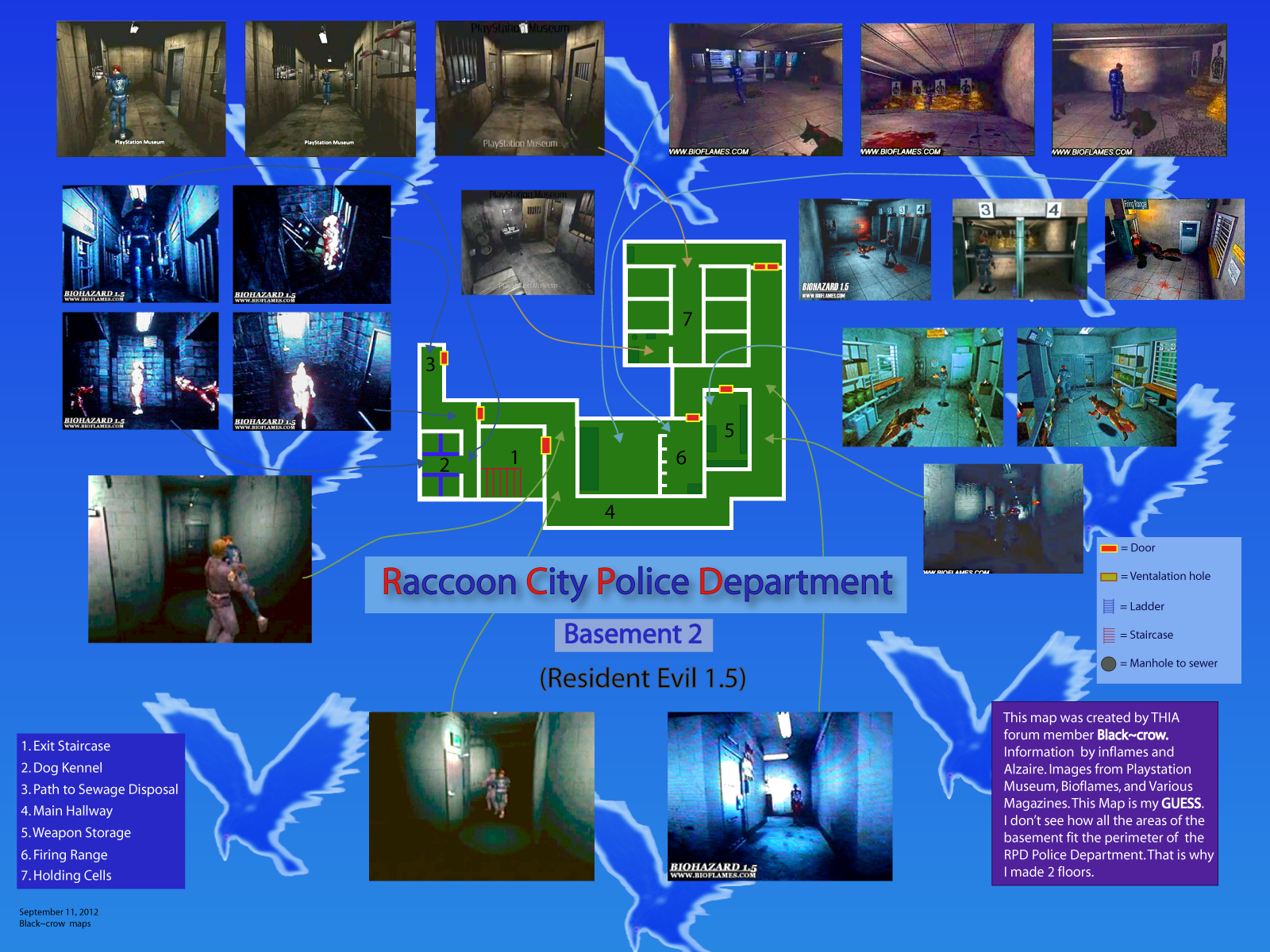 Well Here I have the 1st floor map and Yes I have a B1 and B2 map! I don't see how that big of an area can fit the small frame of the RPD building? So, unless more video or images come about I can't think of how to fit the whole areas together. If you look at my old map, it looks like a disaster. I just trying to make things easier to see. And I was trying to make the crows in the background look smoother, but I am too tired. It is sort of a watermark. I noticed people edited the maps I created and didn't give credit to me.
