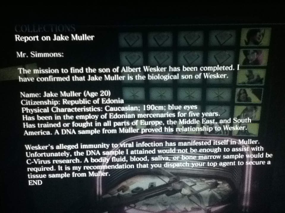 Wesker never had a wife, but the game files tell you about the existence of Jake's mother. She met Wesker in a trip to United States in the early '90s and you can guess what they did next. Then the woman decided to go back to Edonia without telling Wesker she was pregnant, she probably figured out something about Wesker's job and his true personality.