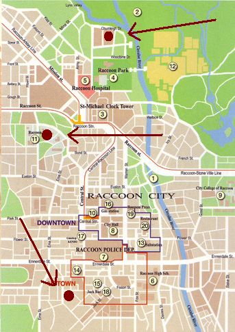The first marc is next to the secret control room of the mercenaries in the warehouse of the cementery and next to the Disposal Facility / Abandoned Factory from RE3. The second one right next to the Raccoon Zoo. And the third two blocks away from the Umbrella Raccoon Office and the Boutique.