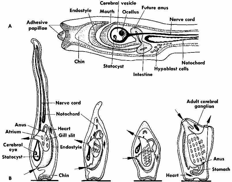 [These] sac-like marine filter feeders. Ascidians are characterized by a tough outer "tunic" made of the polysaccharide tunicin, as compared to other tunicates which are much less robust. They are found all over the world, usually in shallow water with salinities over 2.5%. While members of the Thaliacea and Larvacea swim freely like plankton, sea squirts are sessile animals: they remain firmly attached to substratum such as rocks and shells. There are 2,300 species of ascidians and three main types: solitary ascidians, social ascidians that form clumped communities by attaching at their bases, and compound ascidians that consist of many small individuals (each individual is called a zooid) forming colonies up to several meters in diameter. Sea squirts feed by taking in water through the oral siphon. The water enters the mouth and pharynx, flows through mucus-covered gill slits (also called pharyngeal stigmata) into a water chamber called the atrium, then exits through the atrial siphon.
