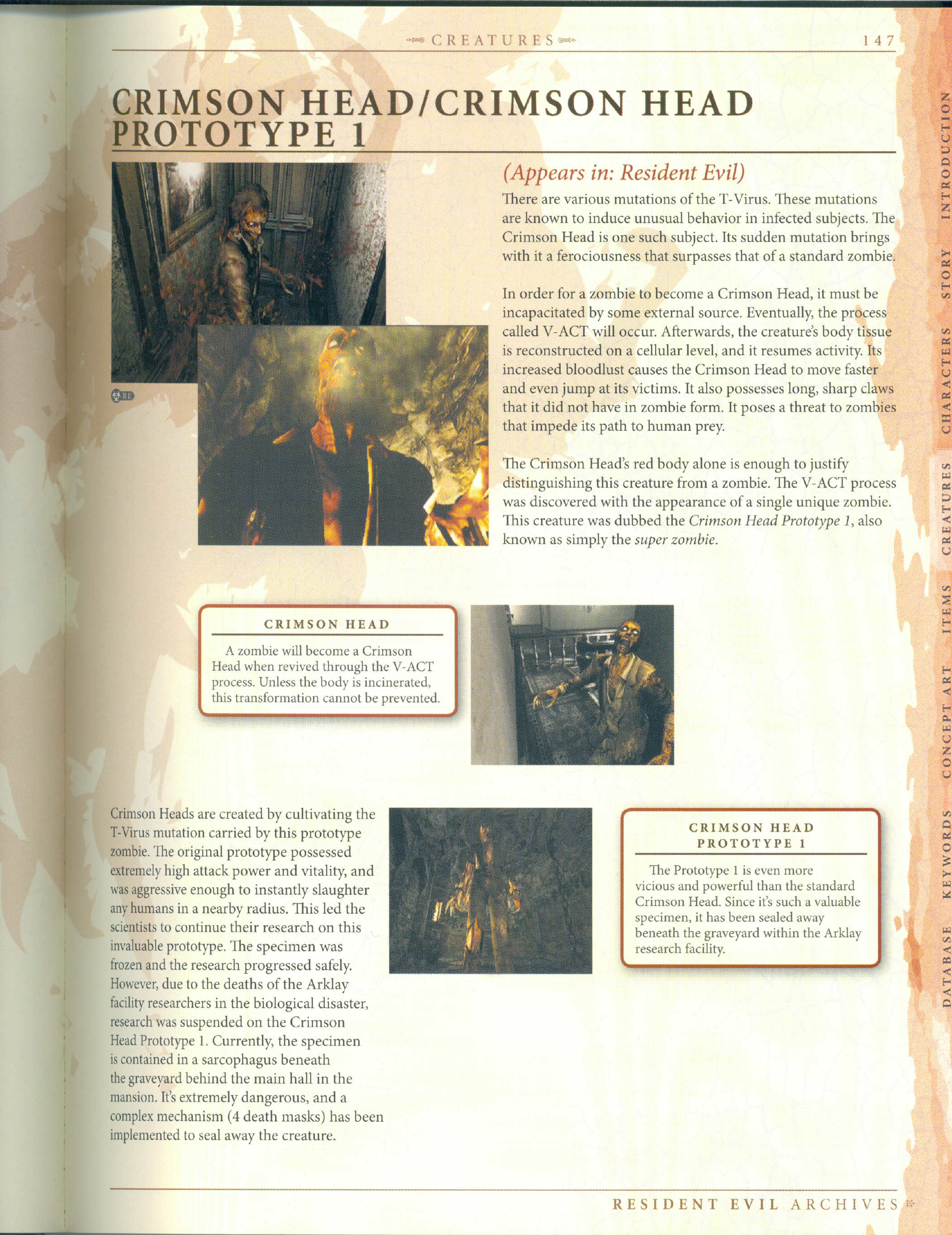 The original Crimson Head gave the researchers an opportunity to notice the process called "V-ACT", and the existence of the virus that came with it. Prototype 1 was created using that particular t-virus type, the effects of which created this Crimson Head possessing vitality and combat skills far exceeding those of regular ones and after that, it underwent cultivated production. An analysis is considered impossible as it is so aggressive it instantly slaughters all surrounding people. But it is still a valuable sample, so it was sealed to examine and research it someday.