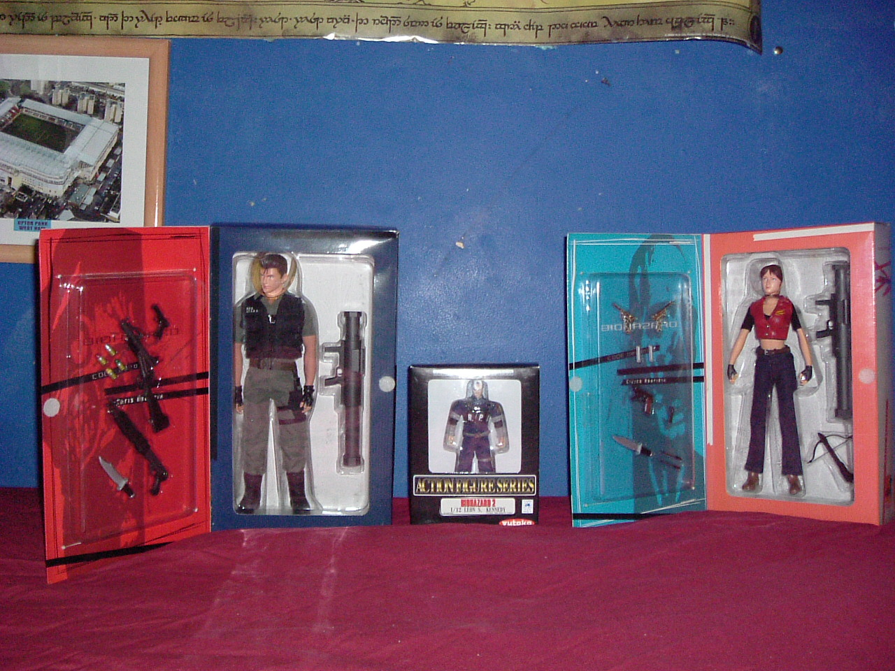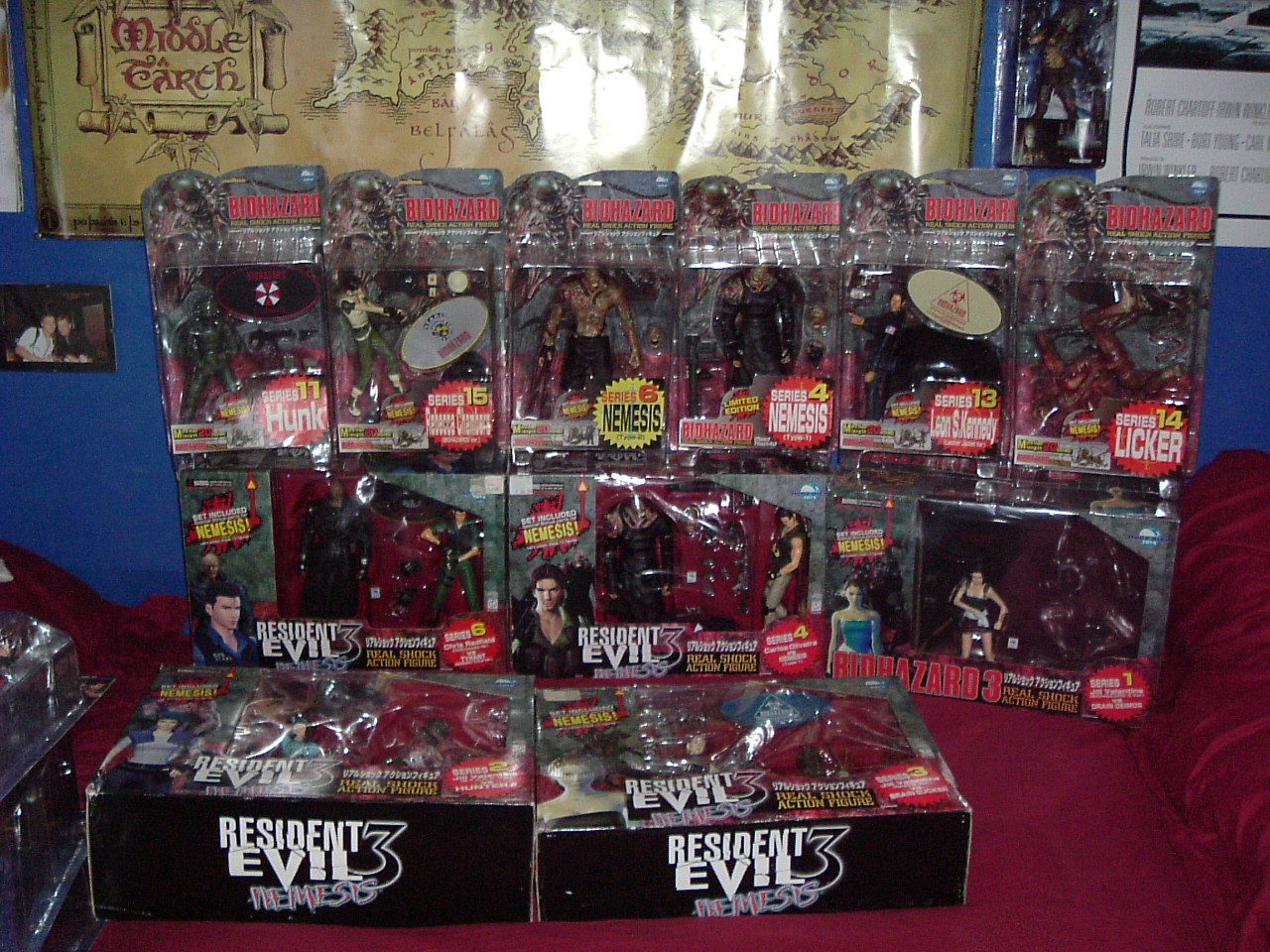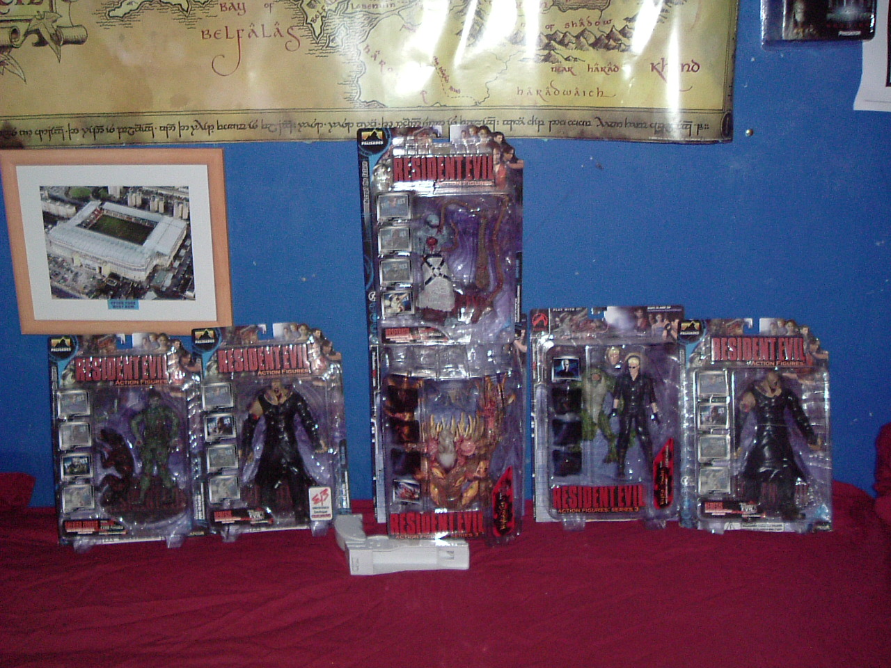 Ok I got my new camra today, so i've decided to put my whole collection of figures on here, the only ones missing is a second lab coat zombie, leon in rpd uniform and my bloody ganado from NECA, which are under my bed. Along with the build yourself Nemesis type 3 and my toy biz series 1, which aren't at my house, i really should get them back from my girlfriend one time, she hates them being in her room, taking up space lol.