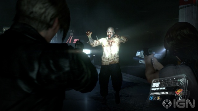 Also note the objective marker in the form of a tiny door just above Leon's gun. That annoys me; this game better not be linear as shit.