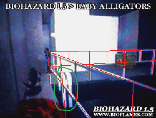 Is THAT what this is? The ladder that you mentioned, the one you climb down to the lower level, showing through the backround? If so, that would make perfect sense. The backrounds are bare bones, with the only things showing up being things that matter, like walls and rails. Unless those are pipes that served some sort of purpose (like being part of some old-school RE puzzle) a ladder is the only other justification I can think of for this to be there at such an early stage of development.