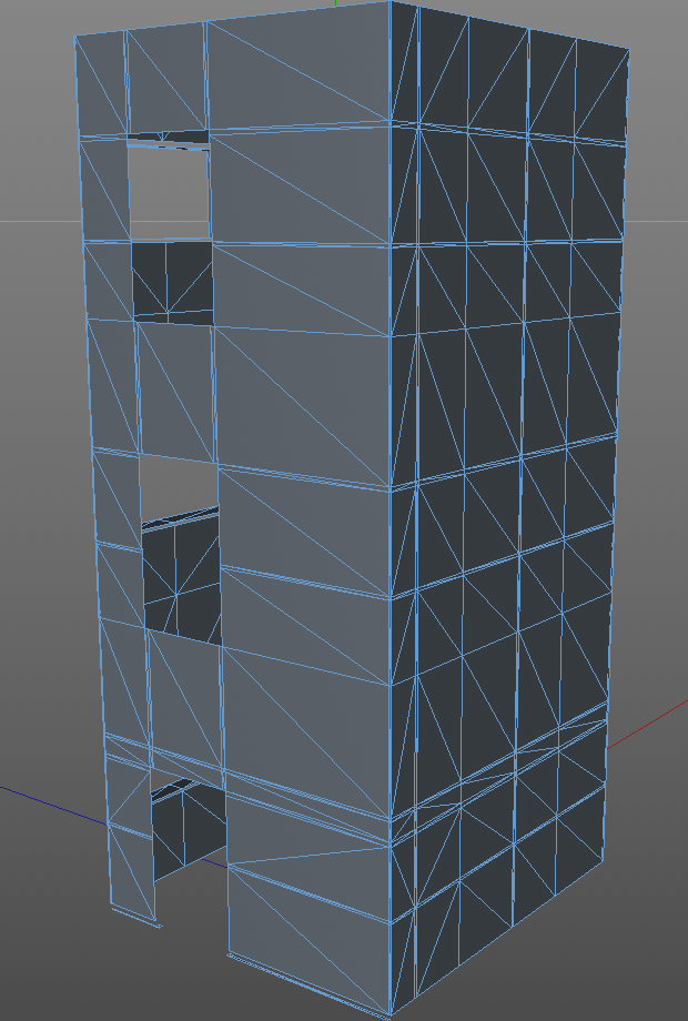 I can't even describe how bad the whole thing is; a total waste of polygons, it's nonsense, edge loops that goes around and do nothing to the shape (a flat wall), disjointed pieces, objects that don't fit in and leaves holes, so that you can see through (doors, stairs, floors, windows), etc.