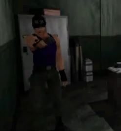 2) Realistically he wouldn't always hold the gun by his side, but that's his default animation in a PS1 game. Both hands with gun facing forward at chest height or below is generally the best way to handle a handgun in combat/ready situations.