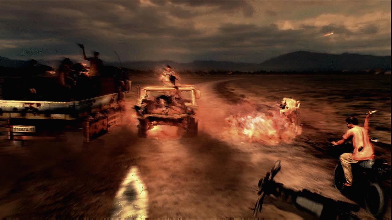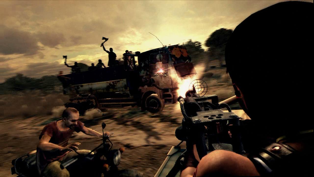 In the chase scene, we only see either of them at the SUNROOF, not at the back(since that would be open kills/hits for the Africans anyways). In the chase scene, Chris and Sheva are alternating; heck, in the TRAILER itself we see Sheva using the gun after the motorbikes land; and in the next camera change we see Chris manning the gun and Sheva disappeared.
